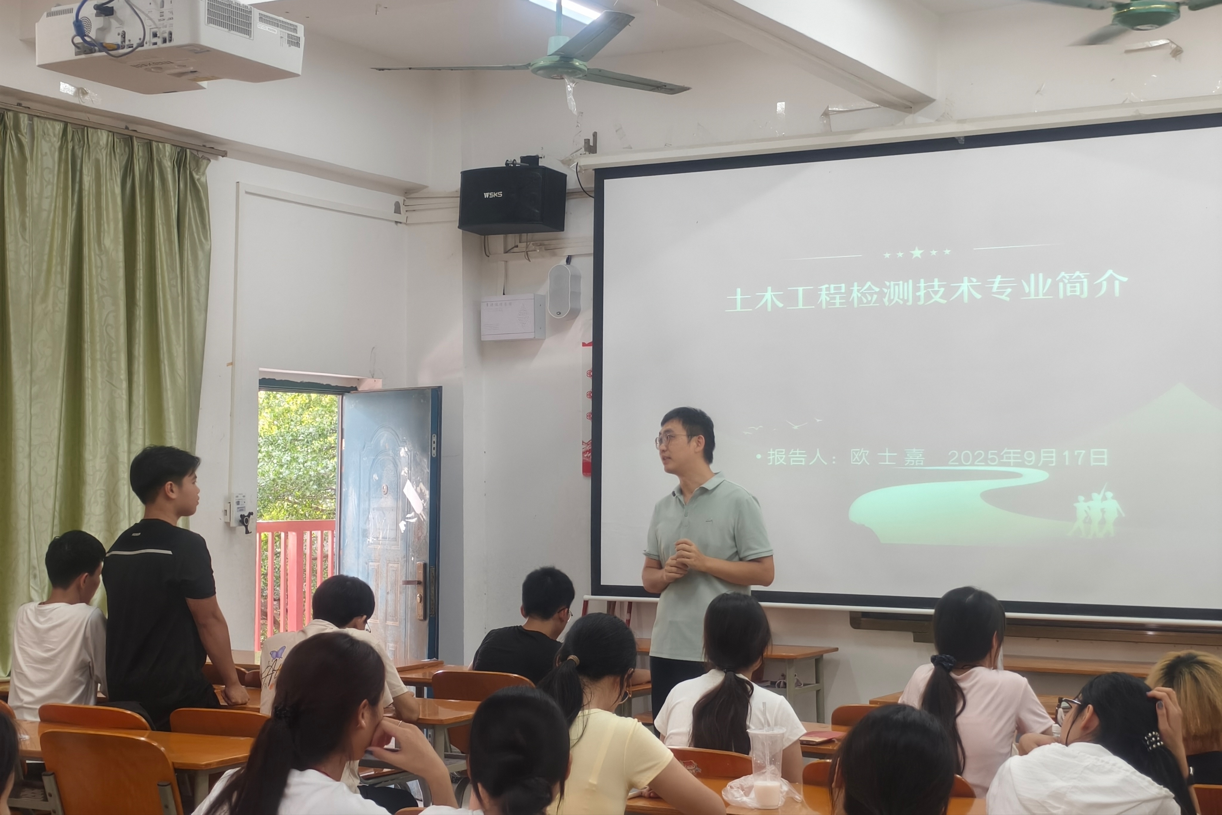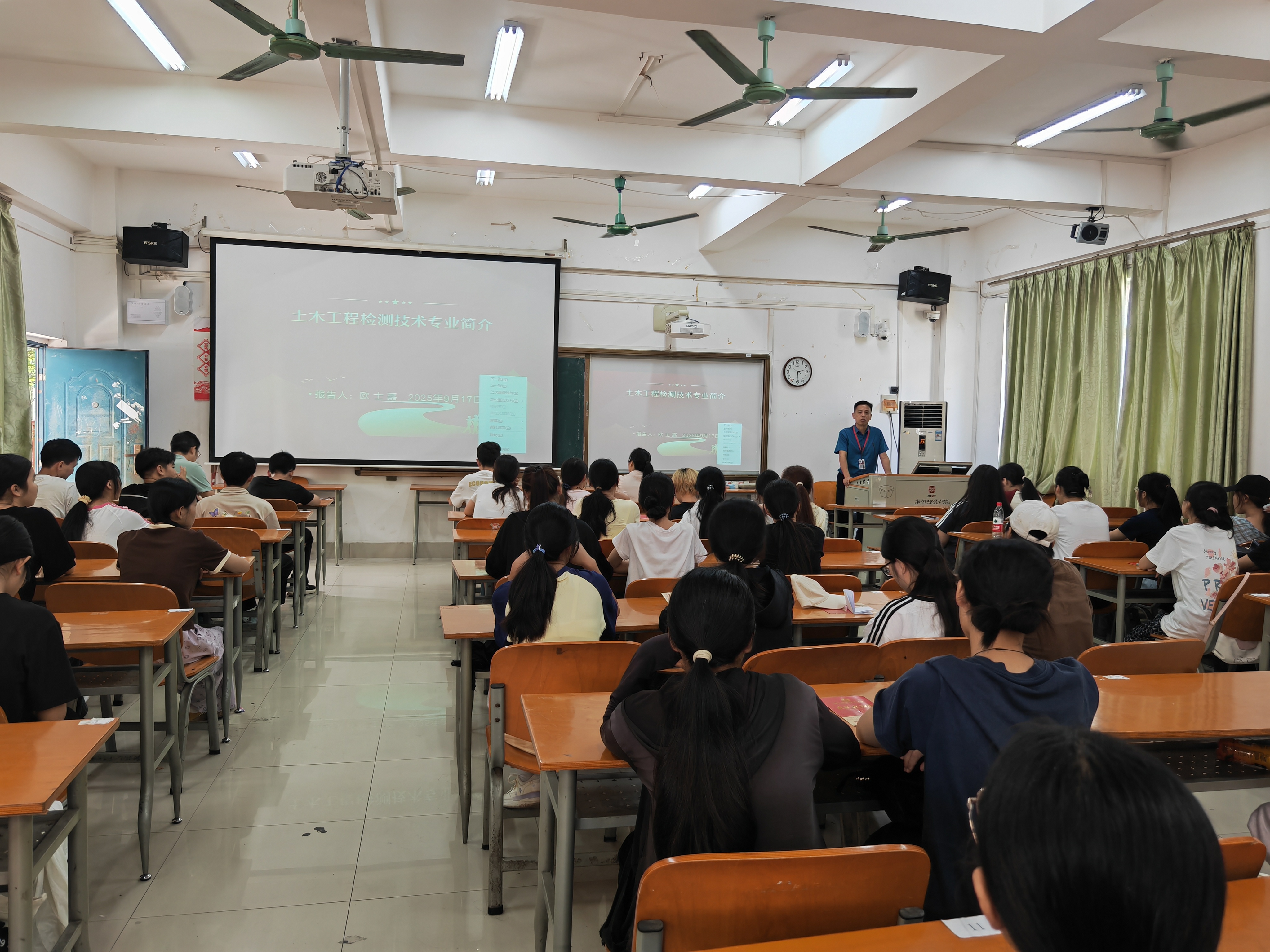 为帮助2025级土木工程检测技术专业新生尽快适应大学环境、深入了解专业内涵、明确未来发展方向,9月17日下午,土木工程检测技术专业在三教C410教室为新生开展入学教育讲座。讲座由专业带头人欧士嘉主持,学院党委副书记吴代生、校企合作单位广西城乡规划设计院工程检测中心的企业导师韦政出席讲座并为新生做专题报告。