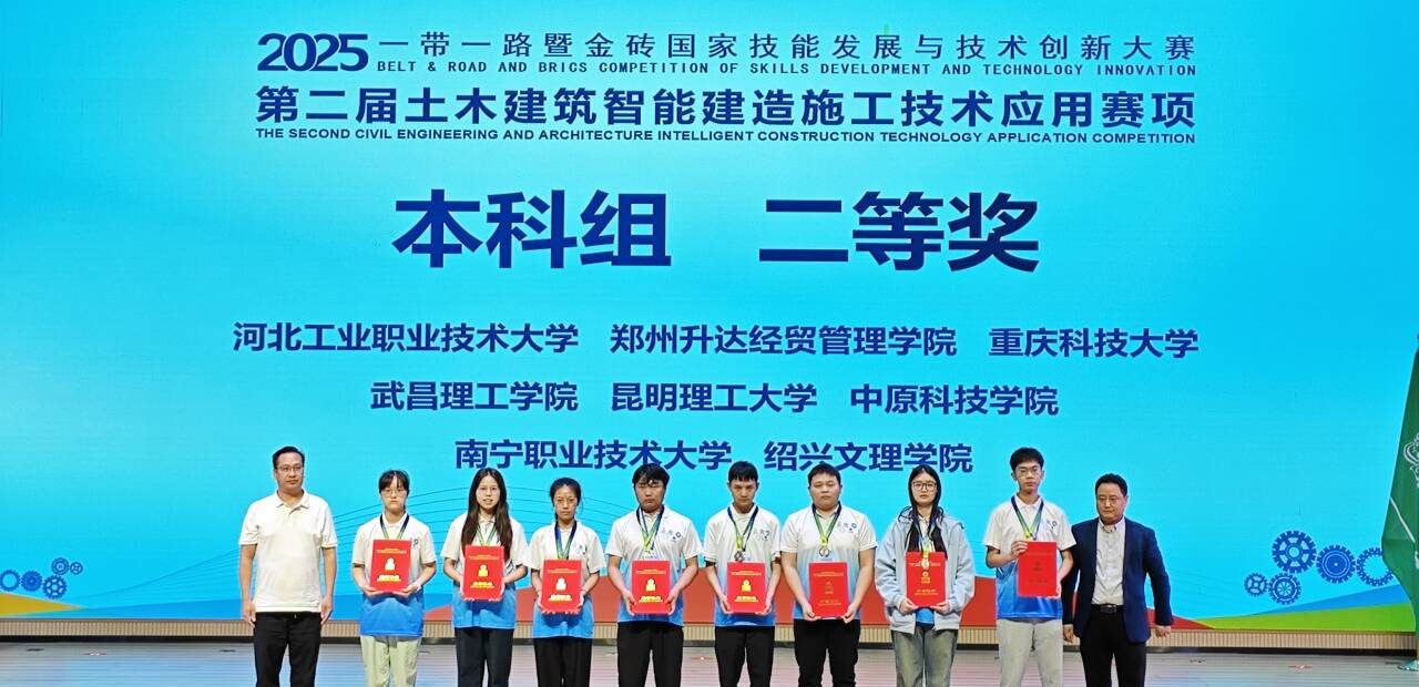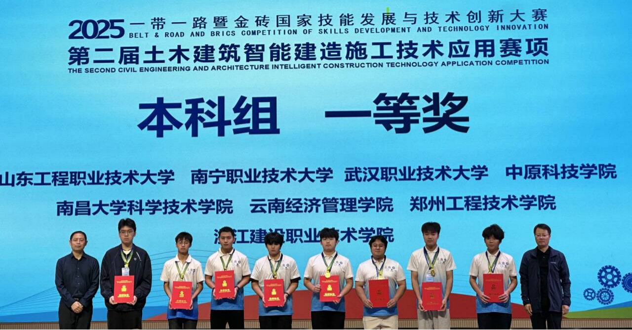 2025年10月17日至19日,2025“一带一路”暨金砖国家技能发展与技术创新大赛第二届土木建筑智能建造施工技术应用赛项全国决赛在重庆安全技术职业学院成功举办。我们建筑工程本科专业学生刘和峥、唐晨凌两位同学在高云河老师指导下,在“土木建筑智能建造”赛项中脱颖而出,获得本科组一等奖,并获得参加国际赛资格。建筑工程本科专业学生许透慧、覃佳媛两位学生获得了市政工程赛项二等奖。
